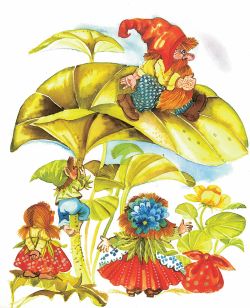 „Už to mám,“ zaradovala se, „podívej se, Drnovečku, vidíš tamten velikánský lopuchový list? Jeho okraj dosahuje dál než do poloviny potůčku – a z něj bychom přeskočili tamhle – na ten blatouch, co roste u druhého břehu, a pak na kamínek, který se leskne růžově přímo naproti nám, a jsme za vodou… Doslova!“