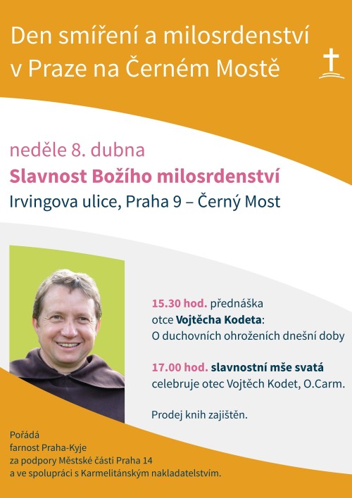 V rámci Dne smíření a milosrdenství v Praze na Černém Mostě vás zveme na přednášku P. Vojtěcha Kodeta, O.Carm., která začíná v neděli 8.4. v 15.30, poté následuje slavnostní mše svatá (v 17.00, celebruje P. Vojtěch Kodet).