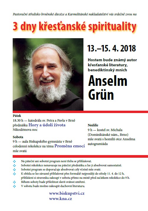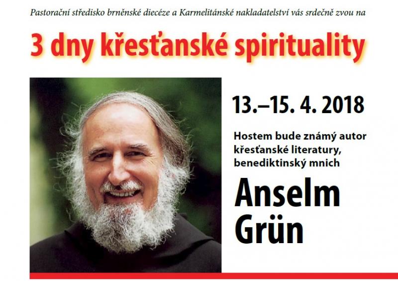 Tři dny křesťanské spirituality v Brně 13.-15.4.Ve dnech pá 13. až ne 15. dubna 2018 pořádá Pastorační středisko brněnské diecéze a Karmelitánské nakladatelství další ročník akce „Tři dny křesťanské spirituality“. Pozvání letos přijal P. Anselm Grün, benediktinský mnich a známý autor křesťanské literatury.